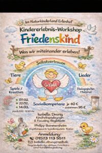 Der dreiteilige Kindererlebnis-Workshop „Friedenskind“ lädt Kinder von 4 bis 9 Jahren dazu ein, spielerisch Gefühle wahrzunehmen, Grenzen zu setzen und Konflikte friedlich zu lösen. Die Workshops verbinden pädagogische Inhalte mit kreativen und musikalischen Elementen in einer lebendigen und kindgerechten Umgebung auf dem Bauernhof.